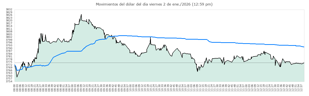 El viernes 2 de enero, en la inauguración del mercado del dólar SPOT para el año 2026, se observó una sólida tendencia alcista desde el inicio de la jornada, con un precio promedio de $3,791.38, cerró por encima de la Tasa Representativa del Mercado (TRM), superándola en $34.30 pesos, la TRM mencionada asignada en $3,757.08 para la sesión.