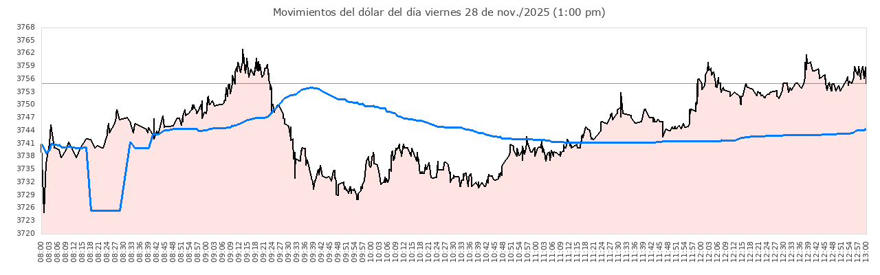 El viernes, el mercado SPOT concluyó la jornada evidenciando un aumento únicamente en comparación con su valor al inicio de la sesión, el precio promedio se situó en $3,744.36, modestamente por debajo de la Tasa Representativa del Mercado (TRM), evidenciando un descuento de $-29.24 pesos, la TRM referida fijada en $3,773.60 para el día.