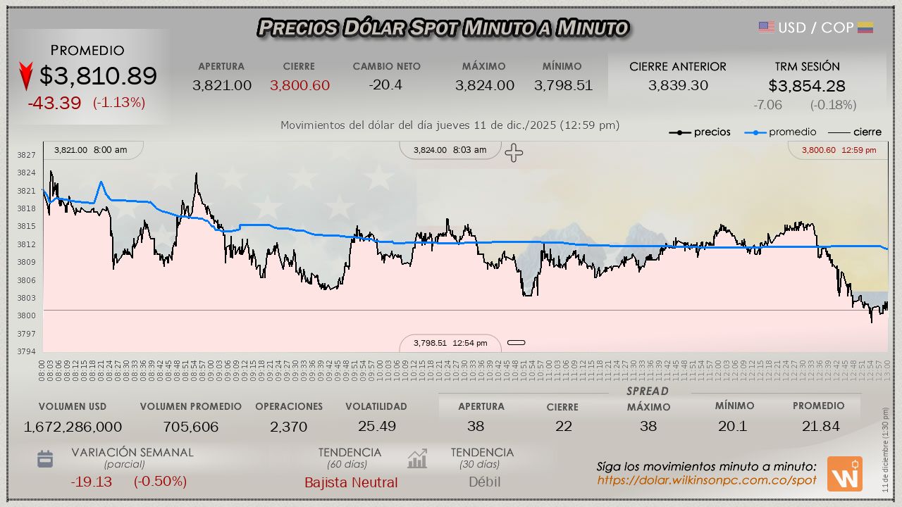 El cierre del mercado SPOT del día viernes, evidenció un descenso continuado desde que inició la jornada, con un precio promedio de $3,788.28, modestamente por debajo de la Tasa Representativa del Mercado (TRM), evidenciando un descuento de $-22.71 pesos, la TRM en cuestión establecida en $3,810.99 para la sesión.