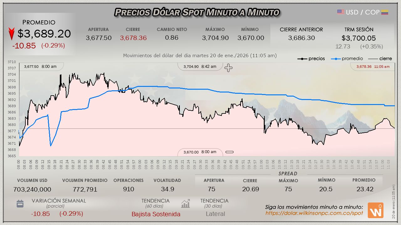 El mercado SPOT concluyó el viernes, evidenciando un firme movimiento ascendente manifestado desde el comienzo del día, el valor medio se situó en $3,700.12, terminó con un margen ligeramente superior de $12.80 pesos en comparación con la Tasa Representativa del Mercado (TRM) vigente, determinada en $3,687.32 para la sesión.