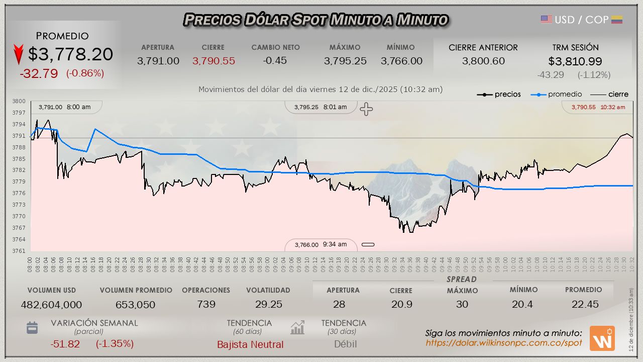 El cierre del mercado SPOT del día jueves, evidenció un descenso continuado desde que inició la jornada, con un precio promedio de $3,810.89, alejándose significativamente de la Tasa Representativa del Mercado (TRM), perdiendo $-43.39 pesos, la TRM referida fijada en $3,854.28 para el día.