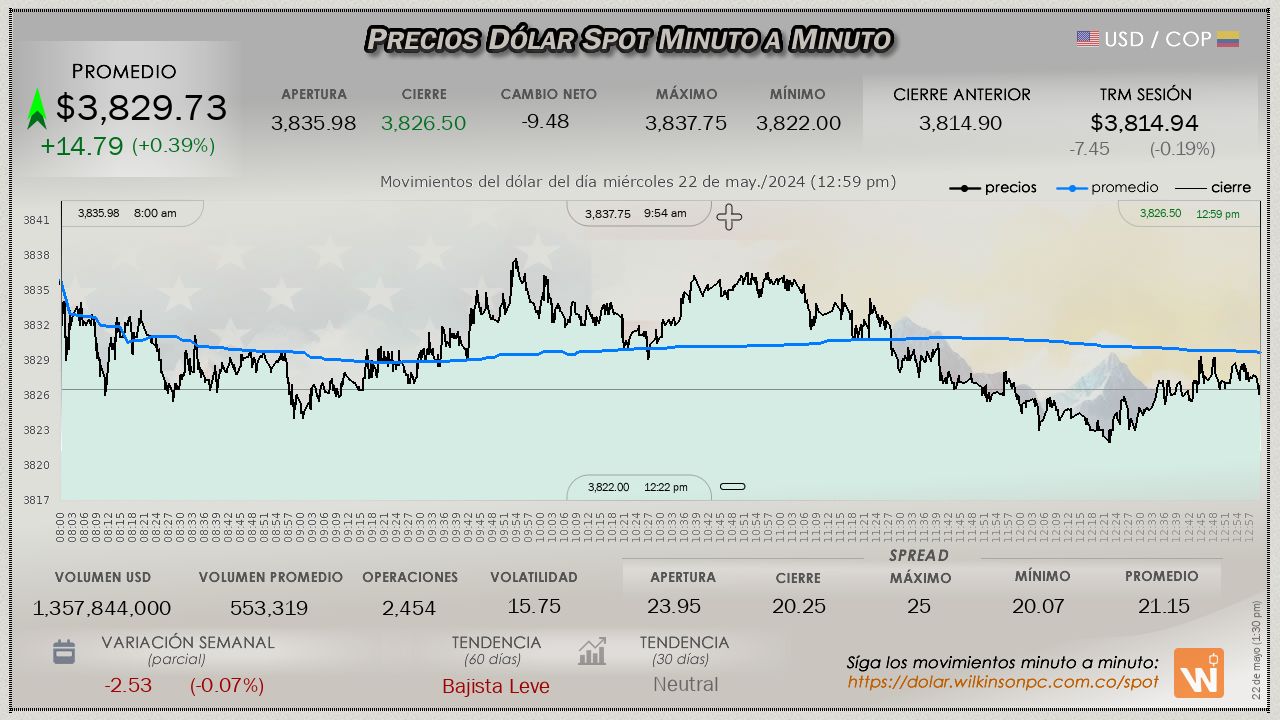 Resumen de las operaciones del mercado del dólar SPOT en Colombia correspondiente al miércoles 22 de mayo de 2024.
