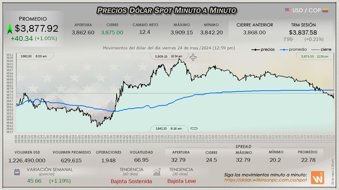 Resumen de las operaciones del mercado del dólar SPOT en Colombia correspondiente al viernes 24 de mayo de 2024.