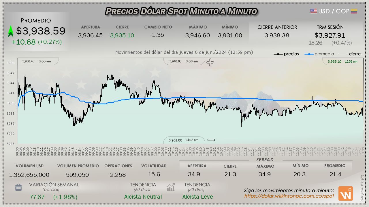 La jornada inició con un precio de apertura de $3,936.45, que superaba a la TRM vigente de $3,927.91. Durante la jornada, el precio alcanzó un máximo de $3,946.60 pesos, y un mínimo de $3,931.00 pesos, generando una volatilidad intradía de $15.60 pesos. Al cierre de la jornada, se situó en $3,935.10, a la baja respecto a la apertura pero cerró al alza respecto a la TRM del día, así como el promedio ponderado con un valor de $3,938.59, una diferencia de $10.68 pesos, un aumento del 0.27% respecto a la TRM.