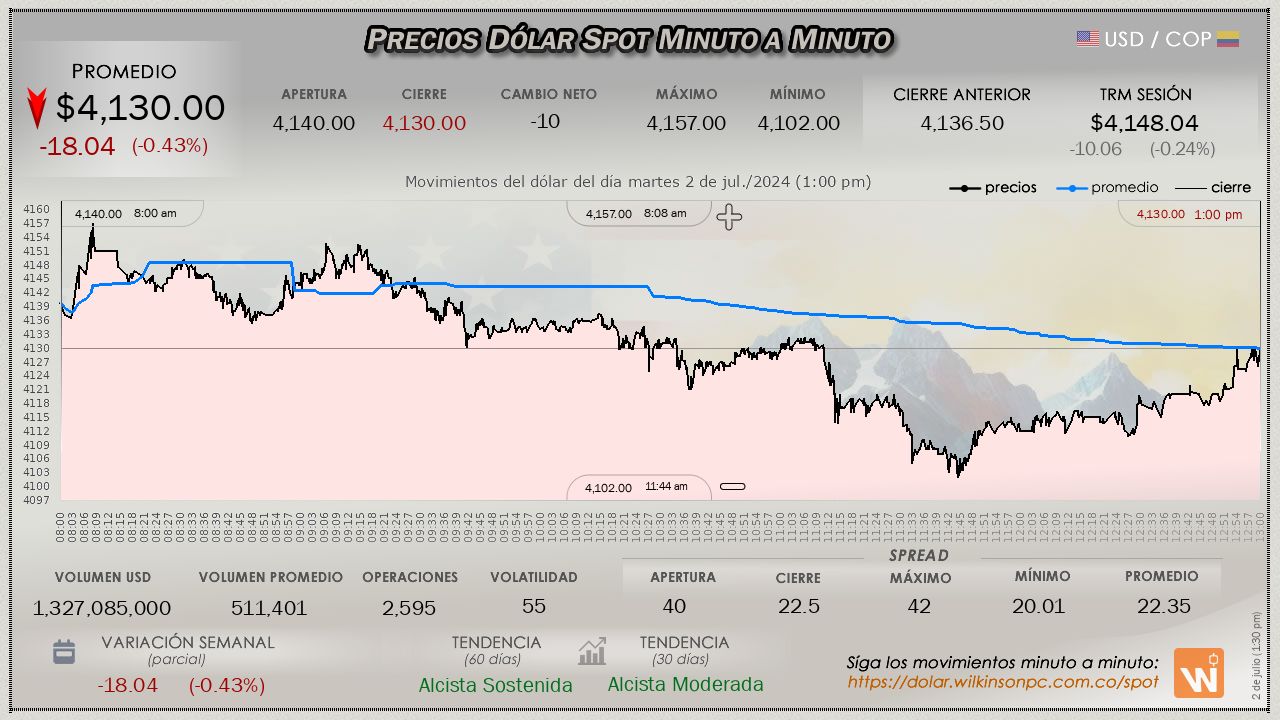 Resumen de las operaciones del mercado del dólar SPOT en Colombia correspondiente al martes 2 de julio de 2024.