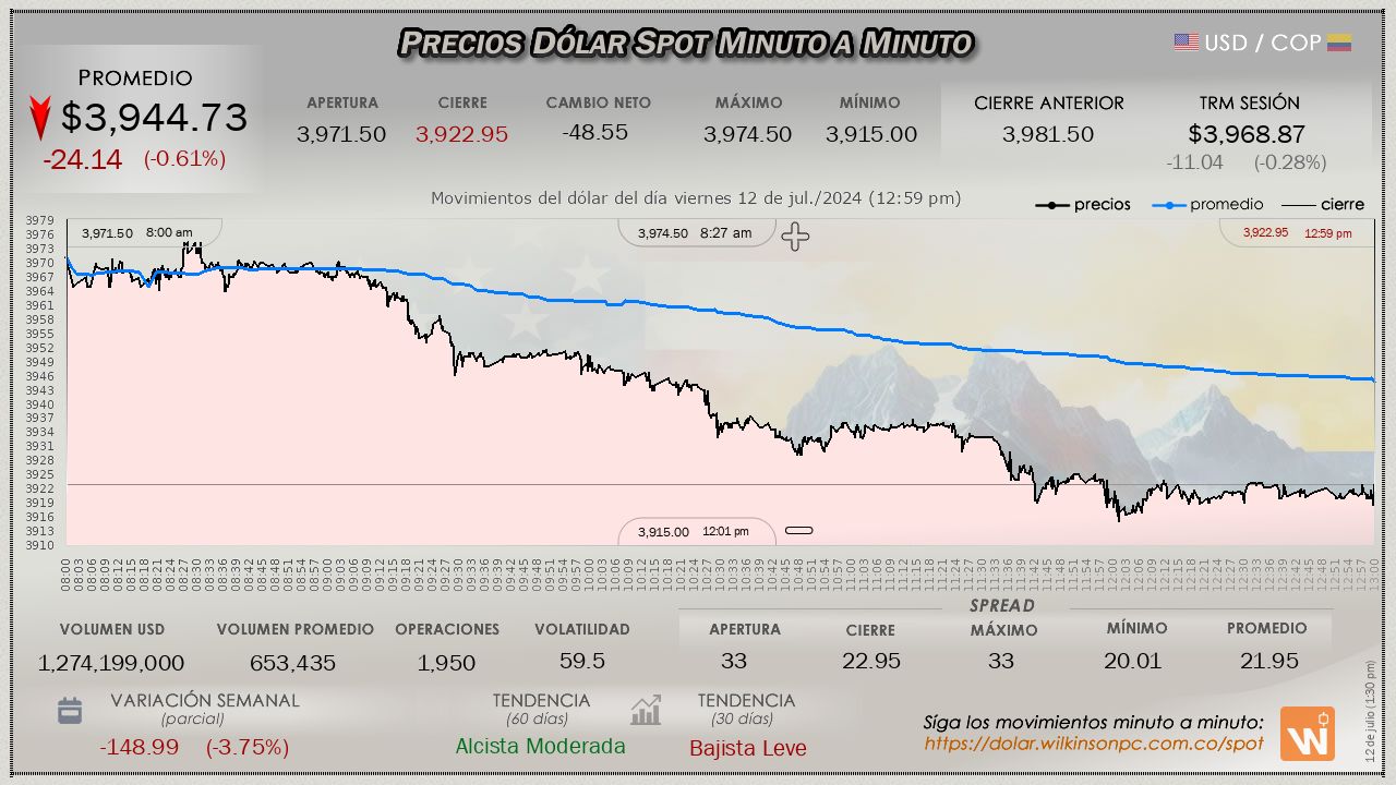 Resumen de las operaciones del mercado del dólar SPOT en Colombia correspondiente al viernes 12 de julio de 2024.