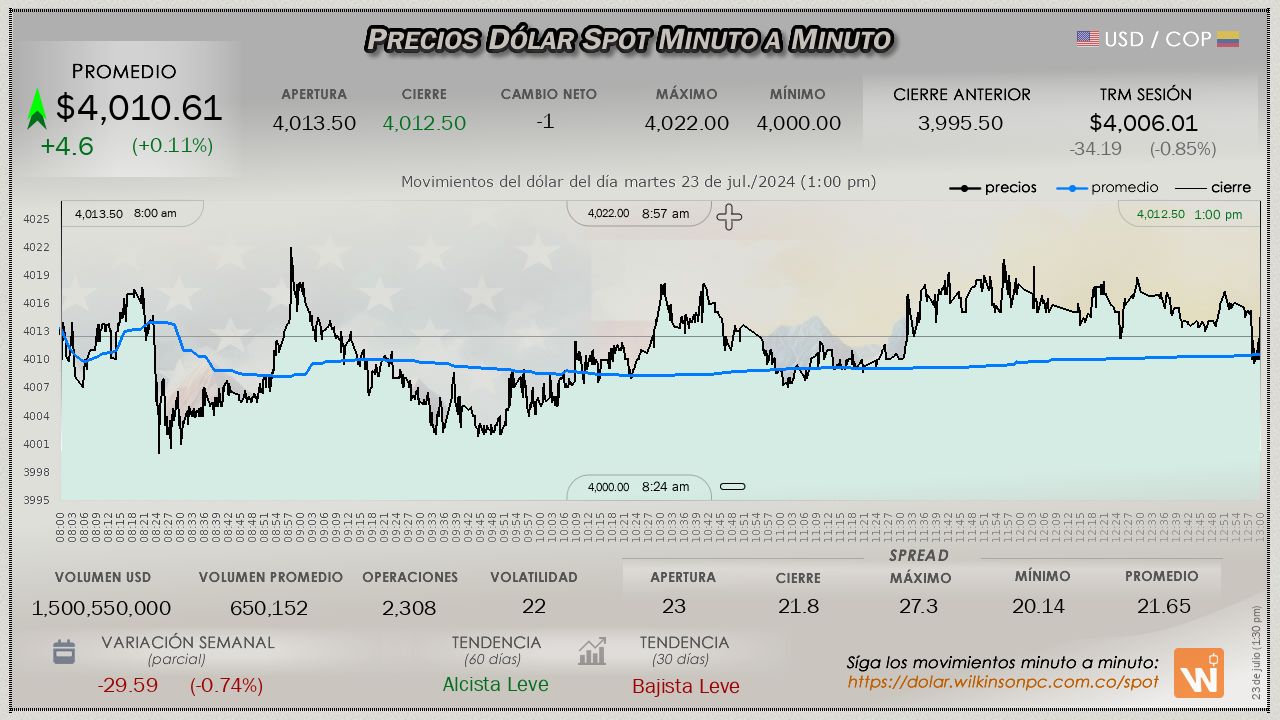 Resumen de las operaciones del mercado del dólar SPOT en Colombia correspondiente al martes 23 de julio de 2024.