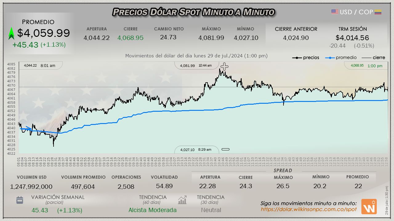Resumen de las operaciones del mercado del dólar SPOT en Colombia correspondiente al lunes 29 de julio de 2024.
