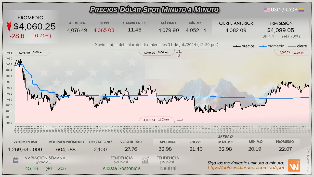 Resumen de las operaciones del mercado del dólar SPOT en Colombia correspondiente al miércoles 31 de julio de 2024.