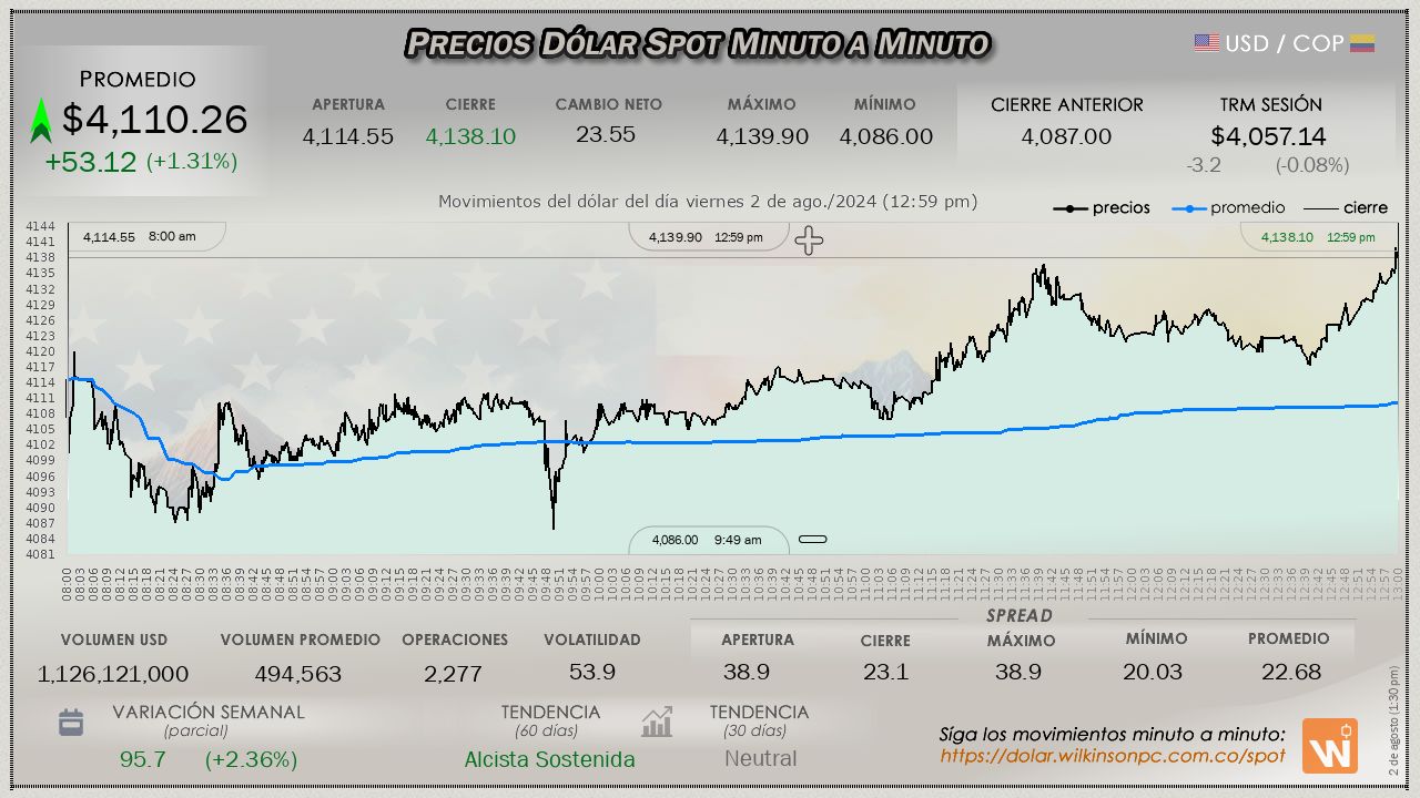 Resumen de las operaciones del mercado del dólar SPOT en Colombia correspondiente al viernes 2 de agosto de 2024.