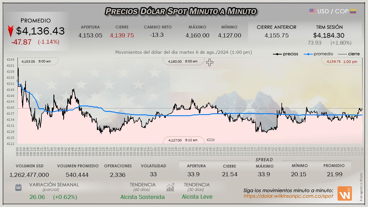 Resumen de las operaciones del mercado del dólar SPOT en Colombia correspondiente al martes 6 de agosto de 2024.