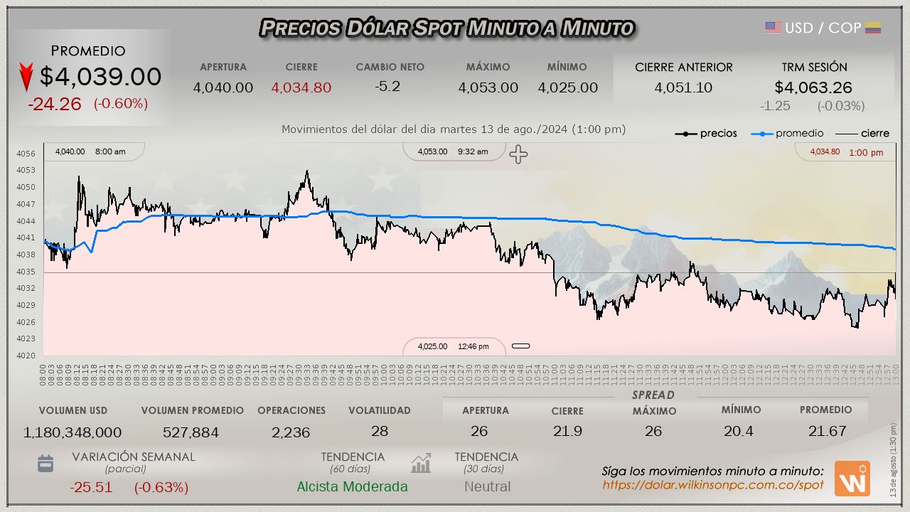 Resumen de las operaciones del mercado del dólar SPOT en Colombia correspondiente al martes 13 de agosto de 2024.