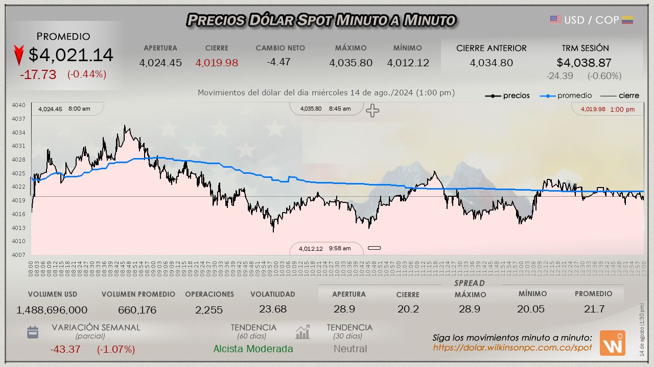 Resumen de las operaciones del mercado del dólar SPOT en Colombia correspondiente al miércoles 14 de agosto de 2024.