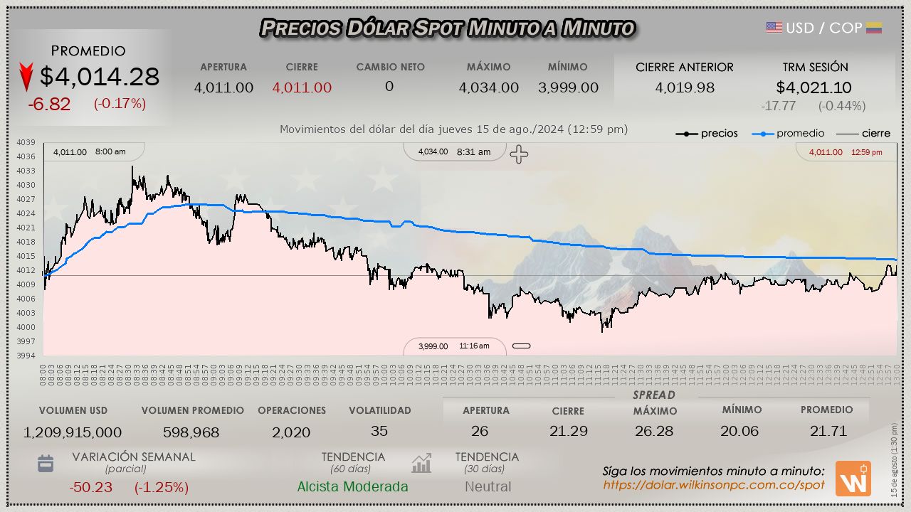 Resumen de las operaciones del mercado del dólar SPOT en Colombia correspondiente al jueves 15 de agosto de 2024.