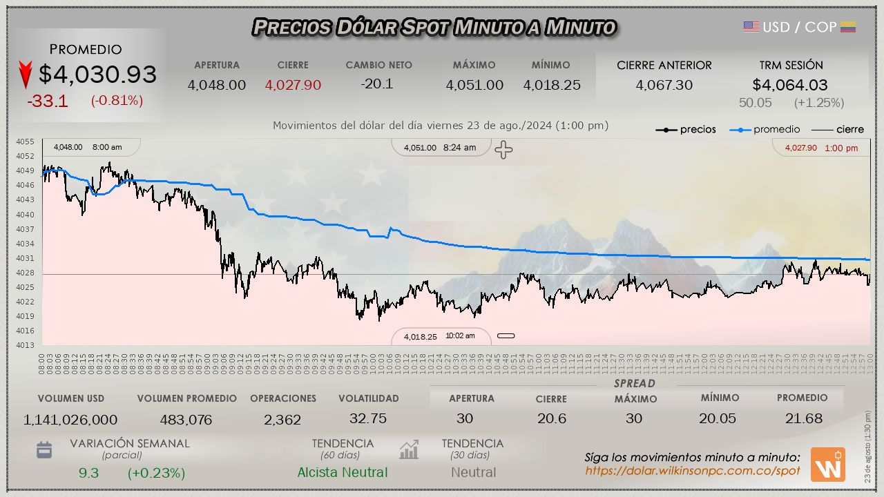 Resumen de las operaciones del mercado del dólar SPOT en Colombia correspondiente al viernes 23 de agosto de 2024.