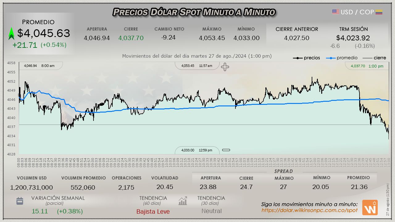 Resumen de las operaciones del mercado del dólar SPOT en Colombia correspondiente al martes 27 de agosto de 2024.