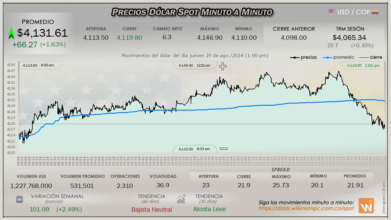 Resumen de las operaciones del mercado del dólar SPOT en Colombia correspondiente al jueves 29 de agosto de 2024.