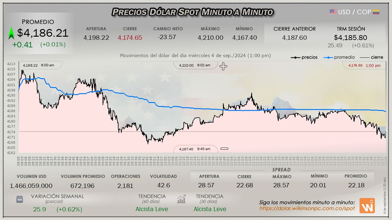 La jornada inició con un precio de apertura de $4,198.22, que superaba a la TRM vigente de $4,185.80. Durante la jornada, el precio alcanzó un máximo de $4,210.00 pesos, y un mínimo de $4,167.40 pesos, generando una volatilidad intradía de $42.60 pesos. Al cierre de la jornada, se situó en $4,174.65, a la baja respecto a la apertura y por debajo de la TRM del día, aunque el promedio ponderado fue suficiente para marcar un alza de $0.41, terminó con un promedio de $4,186.21 pesos, un aumento del 0.01% respecto a la TRM.