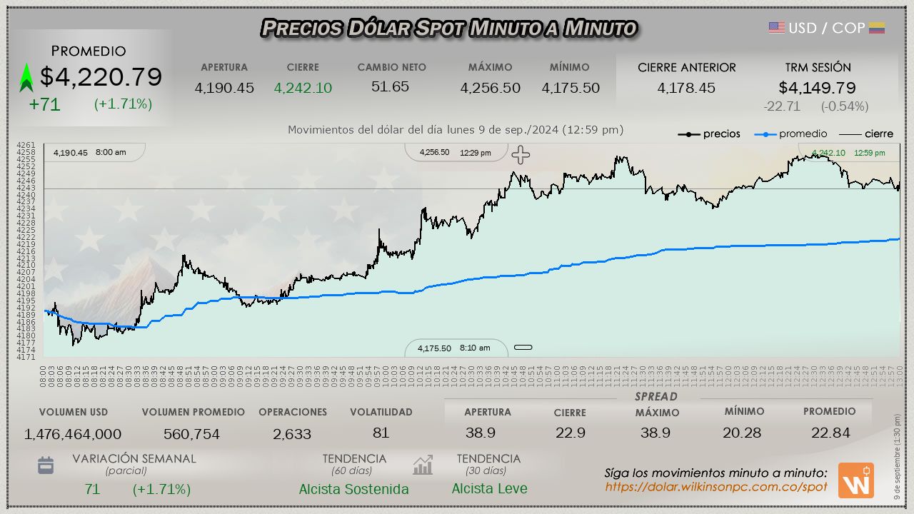 Resumen de las operaciones del mercado del dólar SPOT en Colombia correspondiente al lunes 9 de septiembre de 2024.