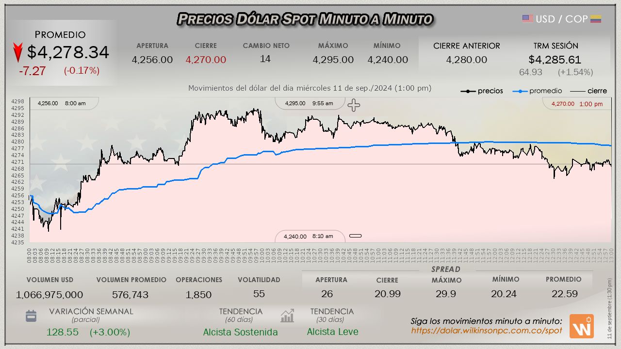 Resumen de las operaciones del mercado del dólar SPOT en Colombia correspondiente al miércoles 11 de septiembre de 2024.