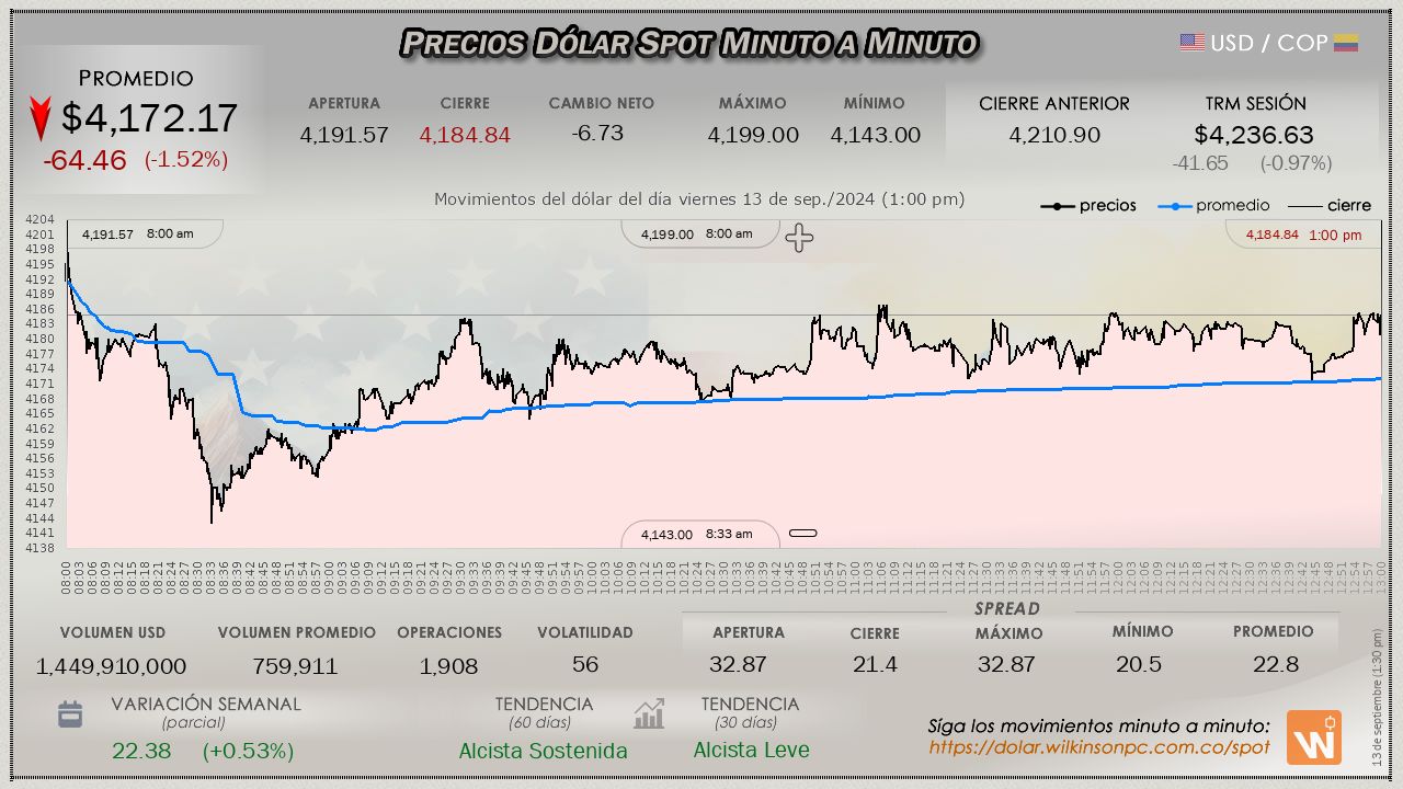 Resumen de las operaciones del mercado del dólar SPOT en Colombia correspondiente al viernes 13 de septiembre de 2024.
