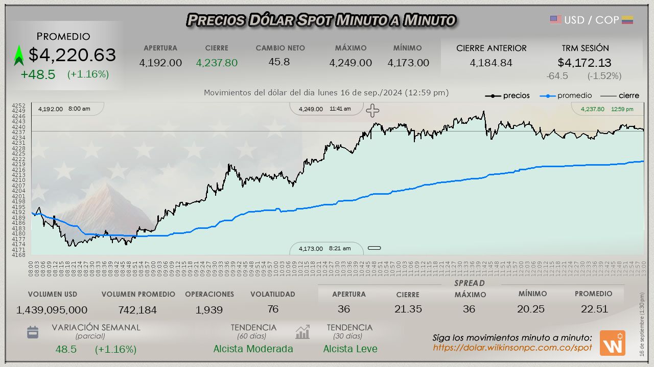 Resumen de las operaciones del mercado del dólar SPOT en Colombia correspondiente al lunes 16 de septiembre de 2024.