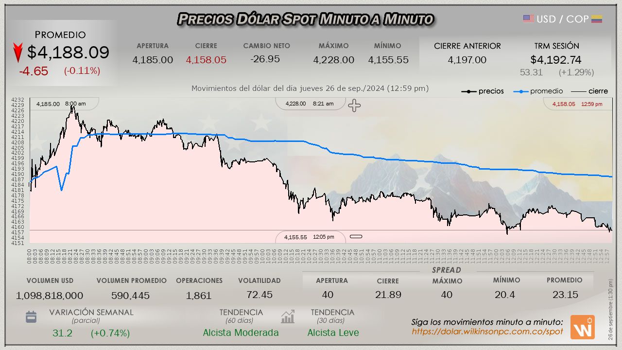 Resumen de las operaciones del mercado del dólar SPOT en Colombia correspondiente al jueves 26 de septiembre de 2024.
