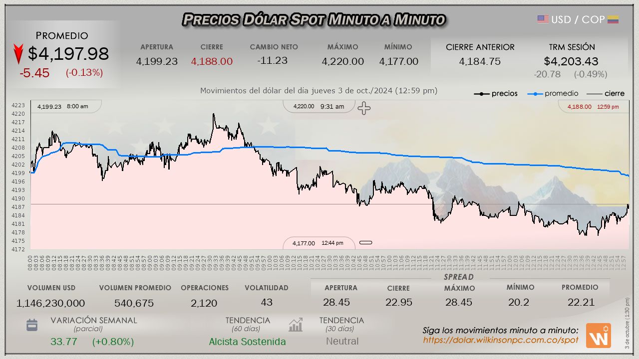 La sesión dió inicio con un precio de apertura de $4,199.23, marcaba así un descenso comparado con la TRM vigente de $4,203.43. Durante la jornada, el precio alcanzó un máximo de $4,220.00 pesos, y un mínimo de $4,177.00 pesos, generando una volatilidad intradía de $43.00 pesos. Al cierre de la jornada, se situó en $4,188.00, a la baja respecto a la apertura y por debajo de la TRM del día, quedando con un promedio ponderado de $4,197.98, una pérdida de $-5.45 pesos, un -0.13% menos respecto a la TRM.