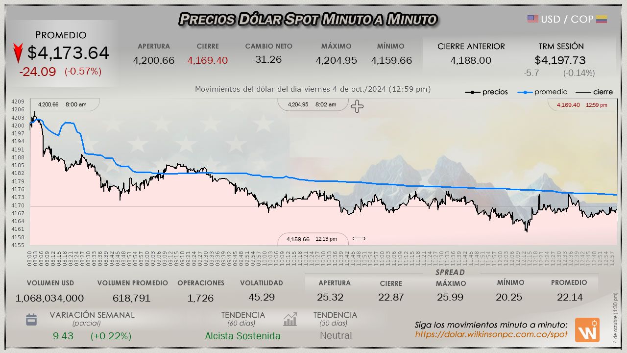 Resumen de las operaciones del mercado del dólar SPOT en Colombia correspondiente al viernes 4 de octubre de 2024.