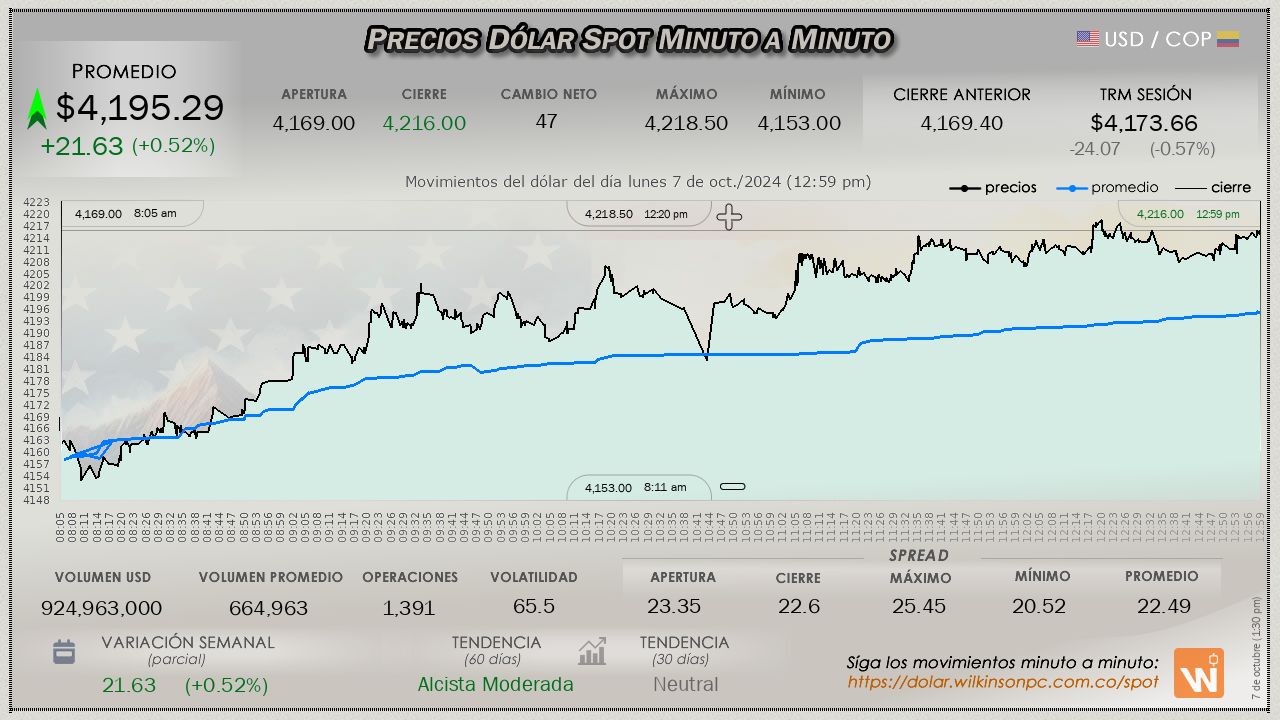 Resumen de las operaciones del mercado del dólar SPOT en Colombia correspondiente al lunes 7 de octubre de 2024.