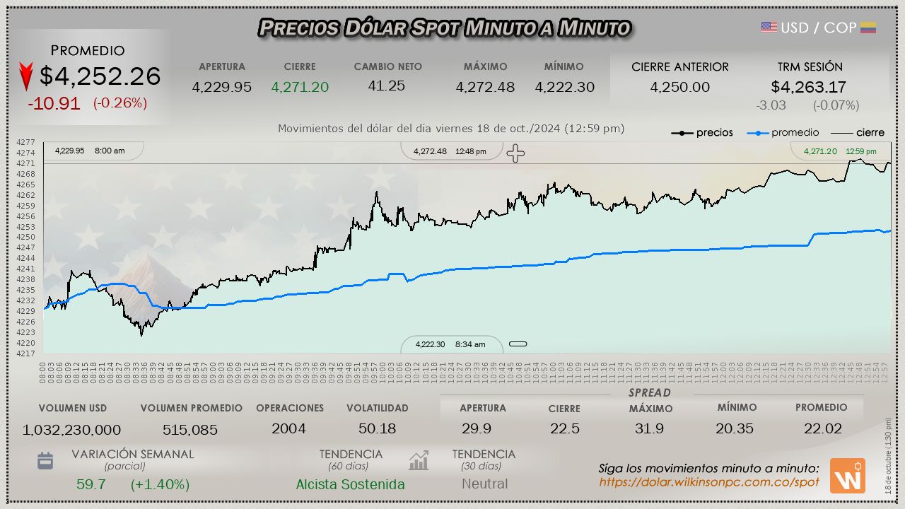 Resumen de las operaciones del mercado del dólar SPOT en Colombia correspondiente al viernes 18 de octubre de 2024.