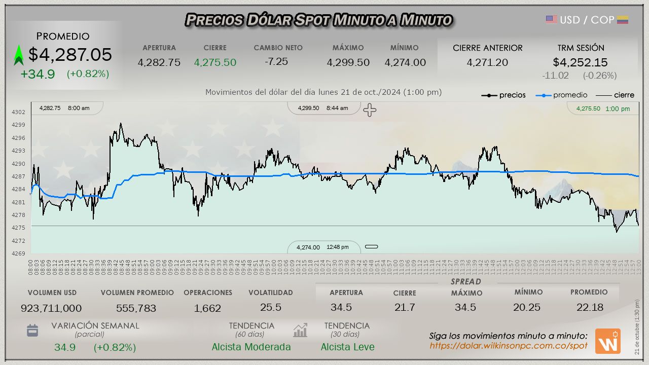 Resumen de las operaciones del mercado del dólar SPOT en Colombia correspondiente al lunes 21 de octubre de 2024.
