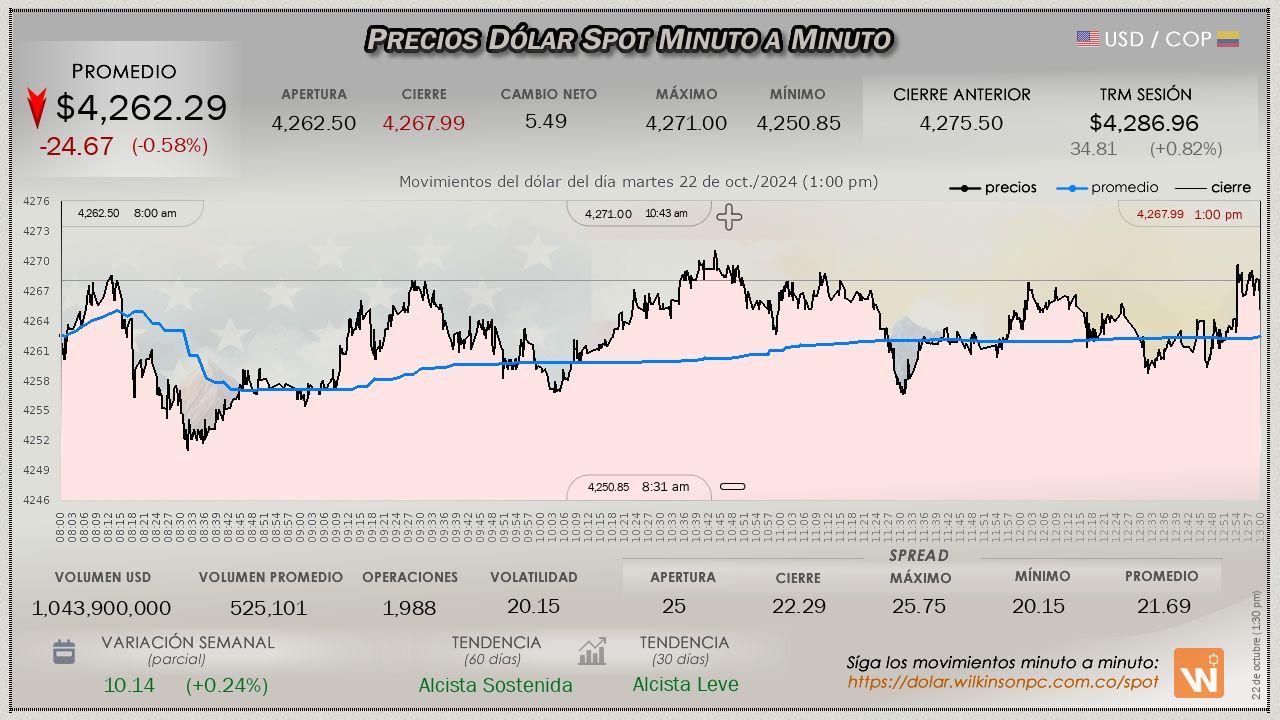 Resumen de las operaciones del mercado del dólar SPOT en Colombia correspondiente al martes 22 de octubre de 2024.