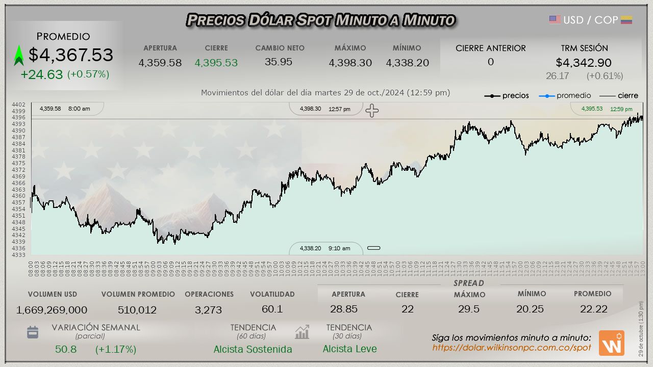 Resumen de las operaciones del mercado del dólar SPOT en Colombia correspondiente al martes 29 de octubre de 2024.