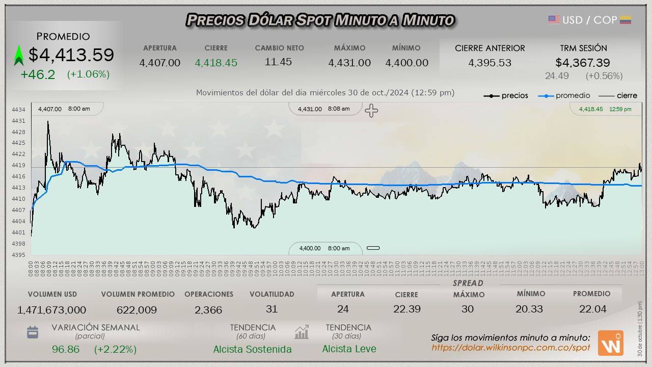 Resumen de las operaciones del mercado del dólar SPOT en Colombia correspondiente al miércoles 30 de octubre de 2024.