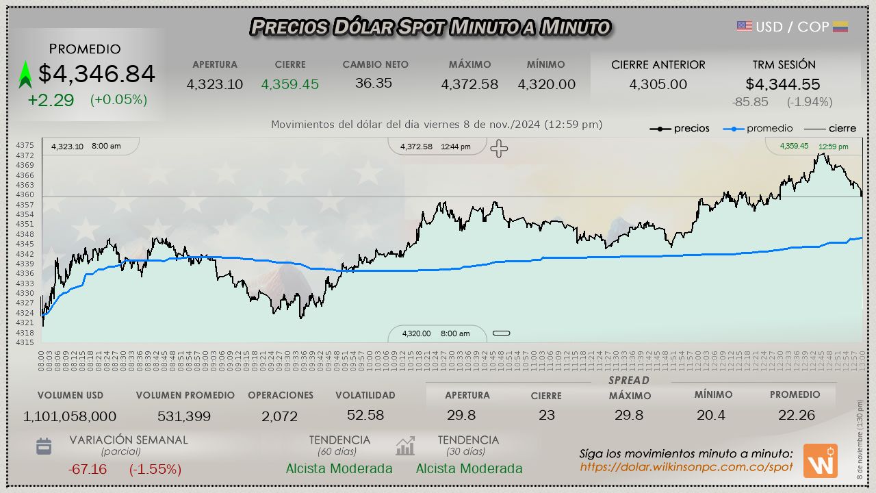 Resumen de las operaciones del mercado del dólar SPOT en Colombia correspondiente al viernes 8 de noviembre de 2024.