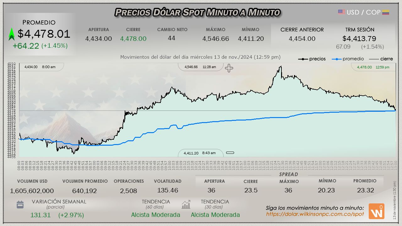 Resumen de las operaciones del mercado del dólar SPOT en Colombia correspondiente al miércoles 13 de noviembre de 2024.