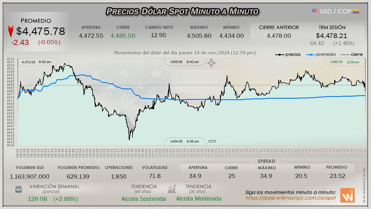 Resumen de las operaciones del mercado del dólar SPOT en Colombia correspondiente al jueves 14 de noviembre de 2024.