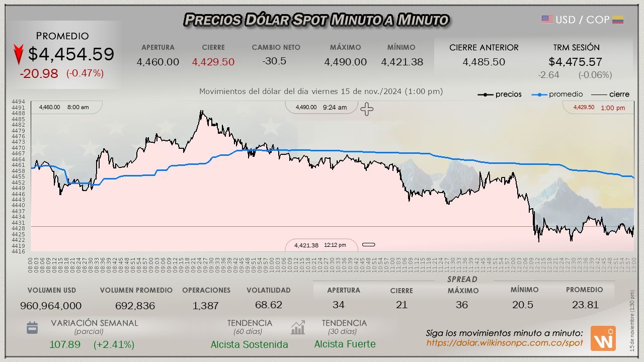 Resumen de las operaciones del mercado del dólar SPOT en Colombia correspondiente al viernes 15 de noviembre de 2024.