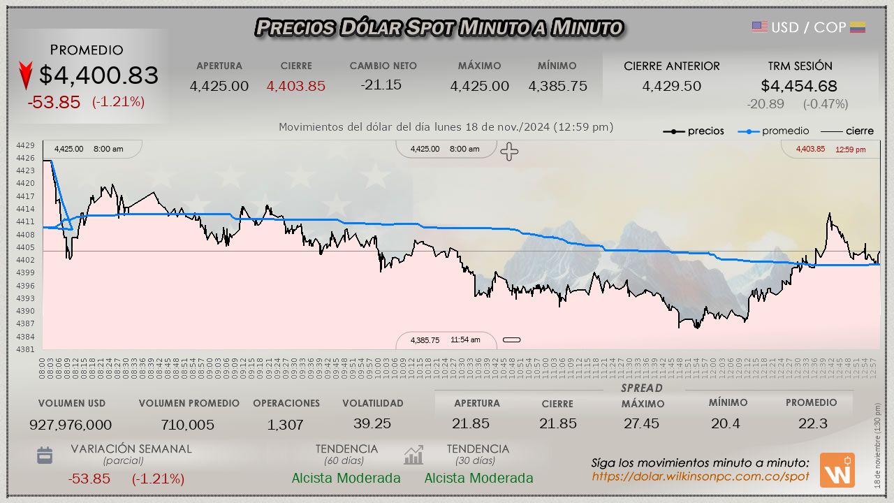 Resumen de las operaciones del mercado del dólar SPOT en Colombia correspondiente al lunes 18 de noviembre de 2024.