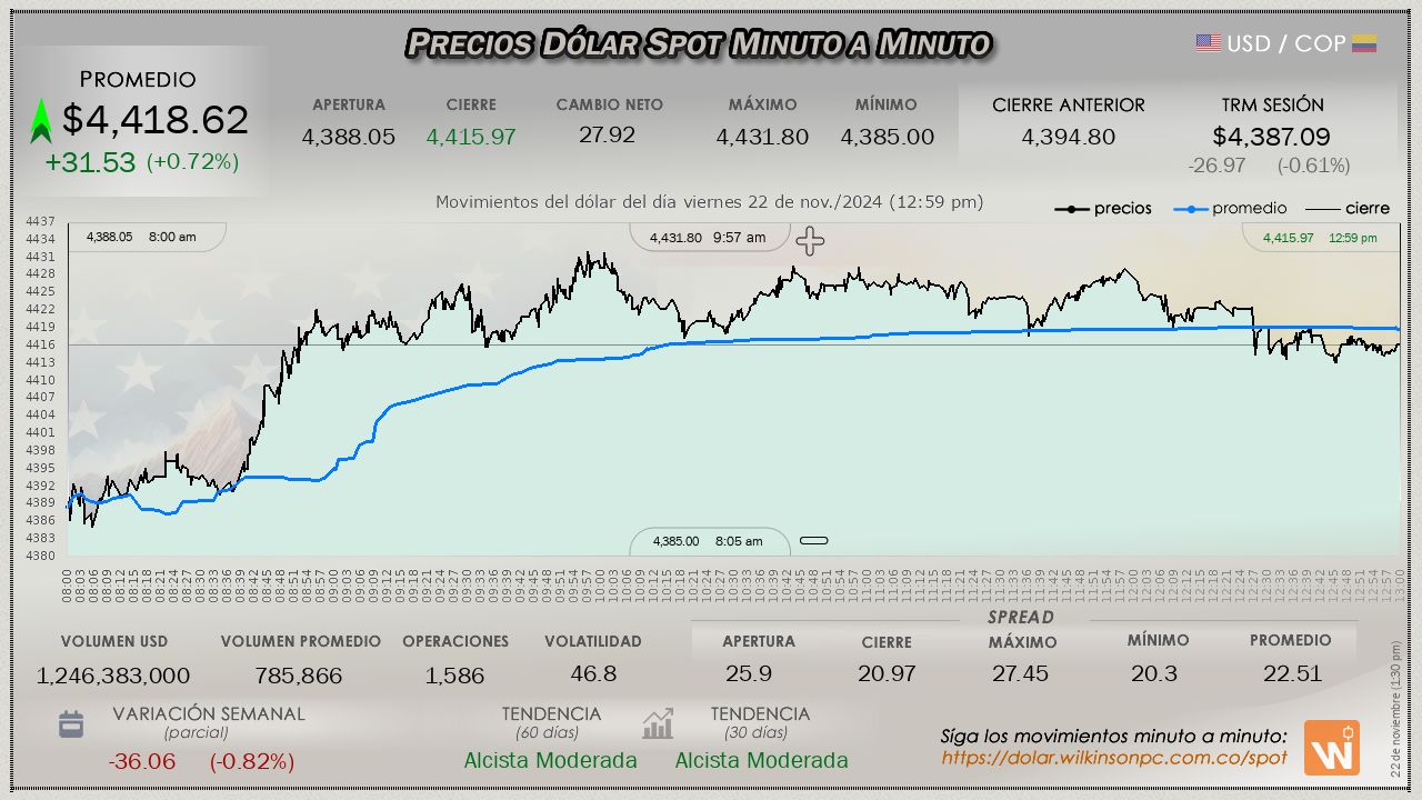 Resumen de las operaciones del mercado del dólar SPOT en Colombia correspondiente al viernes 22 de noviembre de 2024.