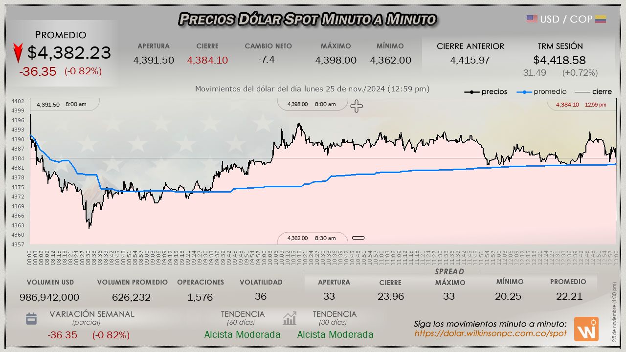 Resumen de las operaciones del mercado del dólar SPOT en Colombia correspondiente al lunes 25 de noviembre de 2024.