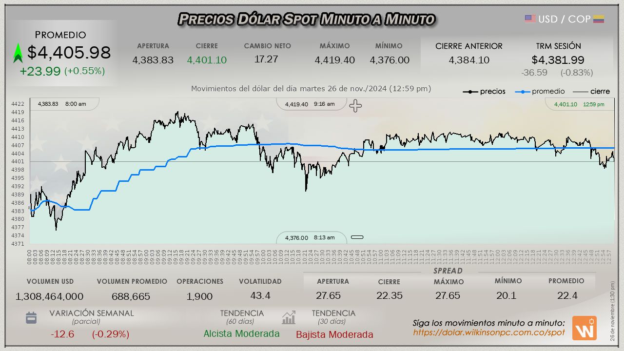 Resumen de las operaciones del mercado del dólar SPOT en Colombia correspondiente al martes 26 de noviembre de 2024.