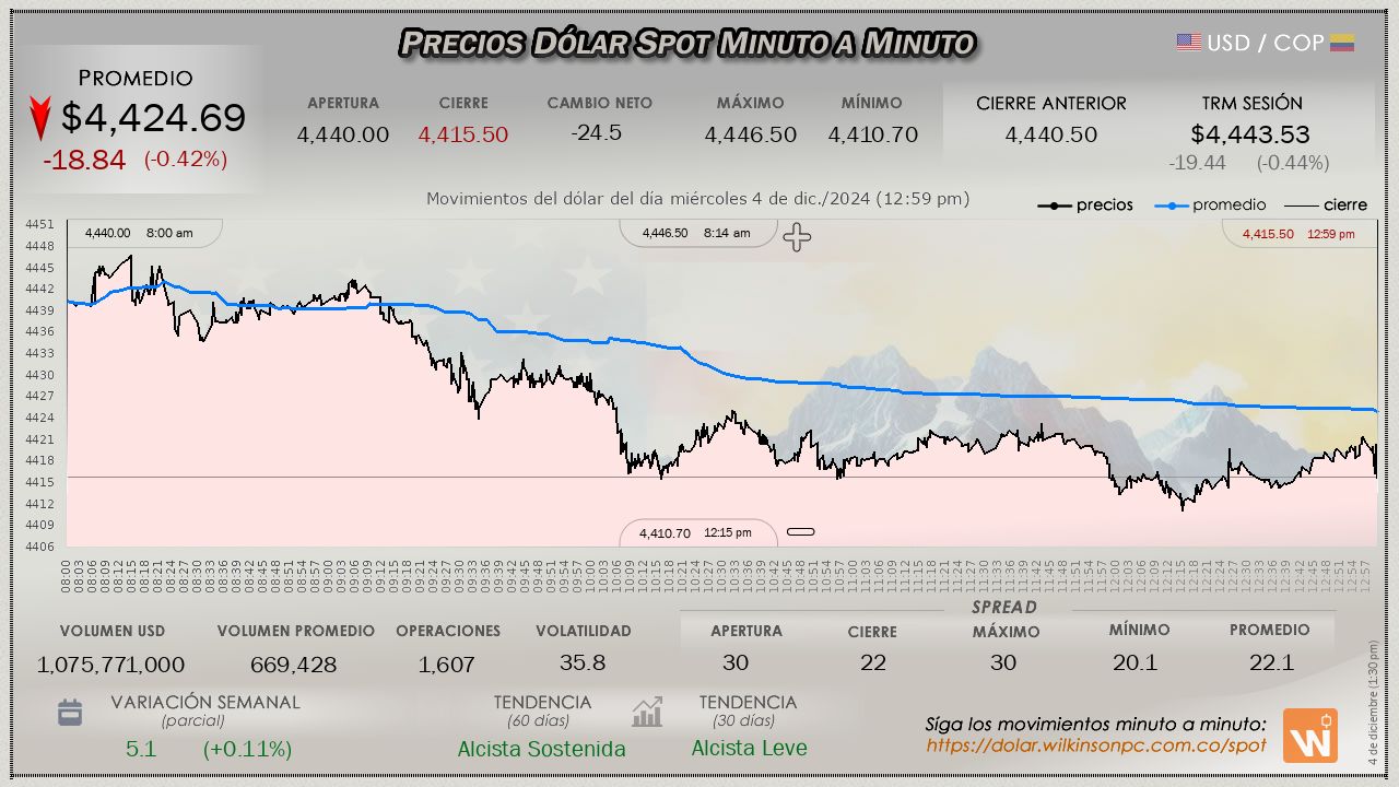 La sesión dió inicio con un precio de apertura de $4,440.00, marcaba así un descenso comparado con la TRM vigente de $4,443.53. Durante la jornada, el precio alcanzó un máximo de $4,446.50 pesos, y un mínimo de $4,410.70 pesos, generando una volatilidad intradía de $35.80 pesos. Al cierre de la jornada, se situó en $4,415.50, a la baja respecto a la apertura y por debajo de la TRM del día, quedando con un promedio ponderado de $4,424.69, una pérdida de $-18.84 pesos, un -0.42% menos respecto a la TRM.