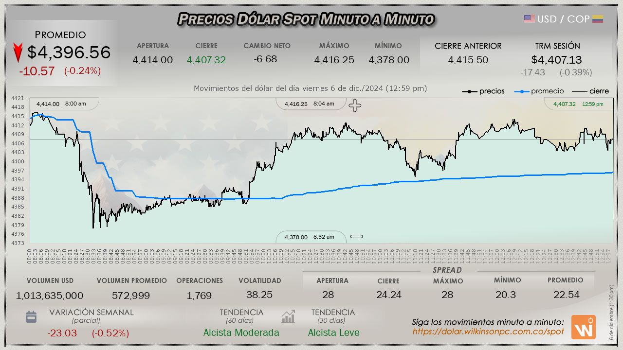 La jornada inició con un precio de apertura de $4,414.00, que superaba a la TRM vigente de $4,407.13. Durante la jornada, el precio alcanzó un máximo de $4,416.25 pesos, y un mínimo de $4,378.00 pesos, generando una volatilidad intradía de $38.25 pesos. Al cierre de la jornada, se situó en $4,407.32, a la baja respecto a la apertura pero cerró al alza respecto a la TRM del día, aunque no bastó la recuperación al final ya que el promedio ponderado quedó en $4,396.56, marcando un descenso de $-10.57 pesos, un -0.24% menos respecto a la TRM. Este descenso fue causado por una reversión de la tendencia observada al inicio de la sesión.