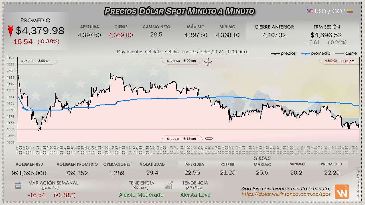 La jornada inició con un precio de apertura de $4,397.50, que superaba a la TRM vigente de $4,396.52. Durante la jornada, el precio alcanzó un máximo de $4,397.50 pesos, y un mínimo de $4,368.10 pesos, generando una volatilidad intradía de $29.40 pesos. Al cierre de la jornada, se situó en $4,369.00, a la baja respecto a la apertura y por debajo de la TRM del día, quedando con un promedio ponderado de $4,379.98, una pérdida de $-16.54 pesos, un -0.38% menos respecto a la TRM. Este descenso fue causado por una reversión de la tendencia observada al inicio de la sesión.
