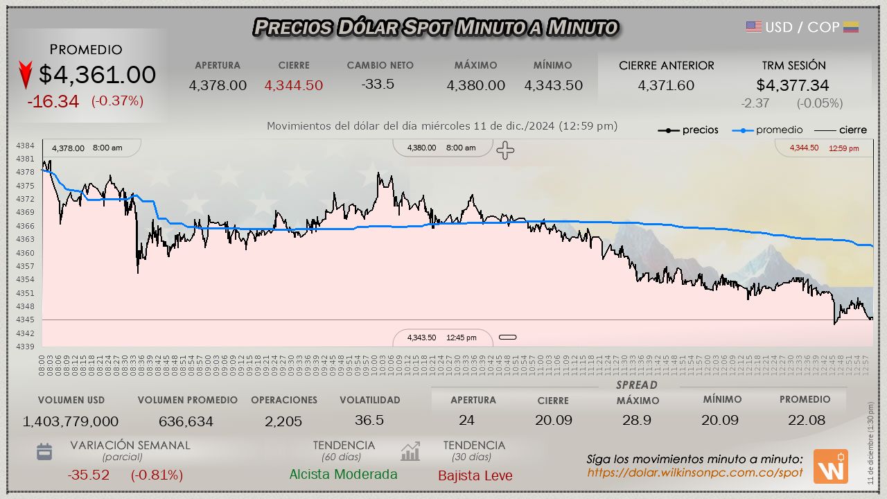 Resumen de las operaciones del mercado del dólar SPOT en Colombia correspondiente al miércoles 11 de diciembre de 2024.
