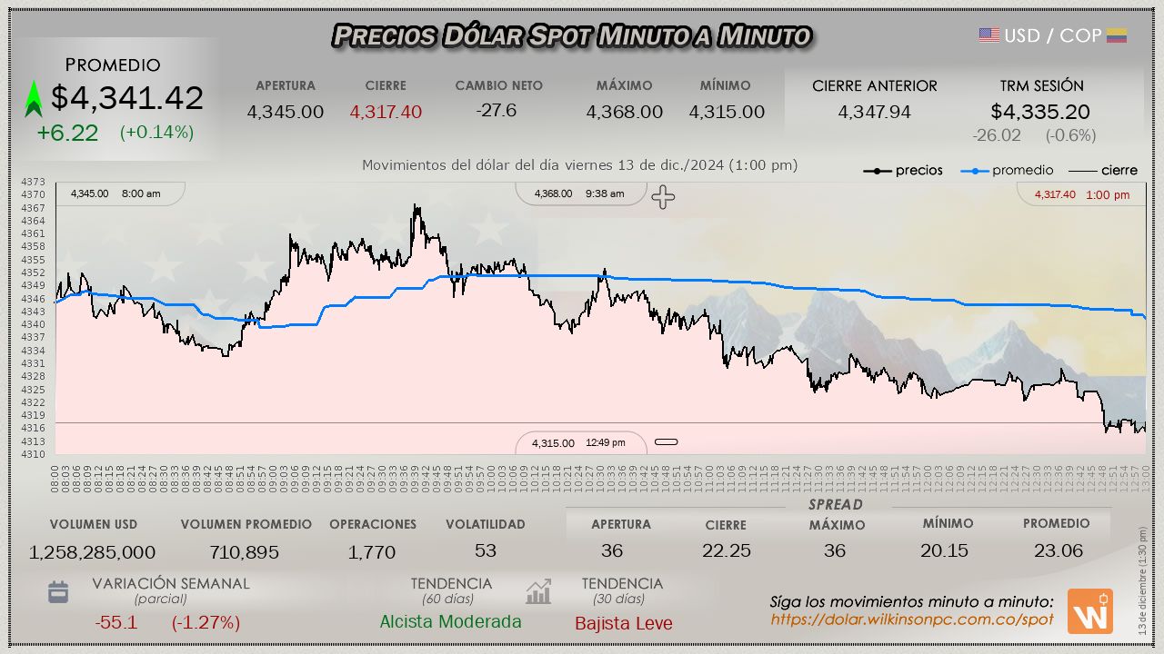 Resumen de las operaciones del mercado del dólar SPOT en Colombia correspondiente al viernes 13 de diciembre de 2024.