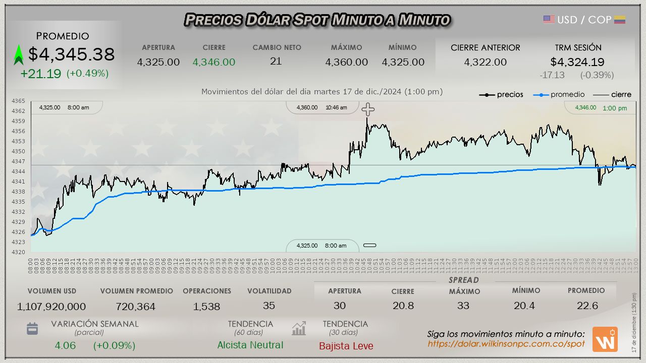 Resumen de las operaciones del mercado del dólar SPOT en Colombia correspondiente al martes 17 de diciembre de 2024.