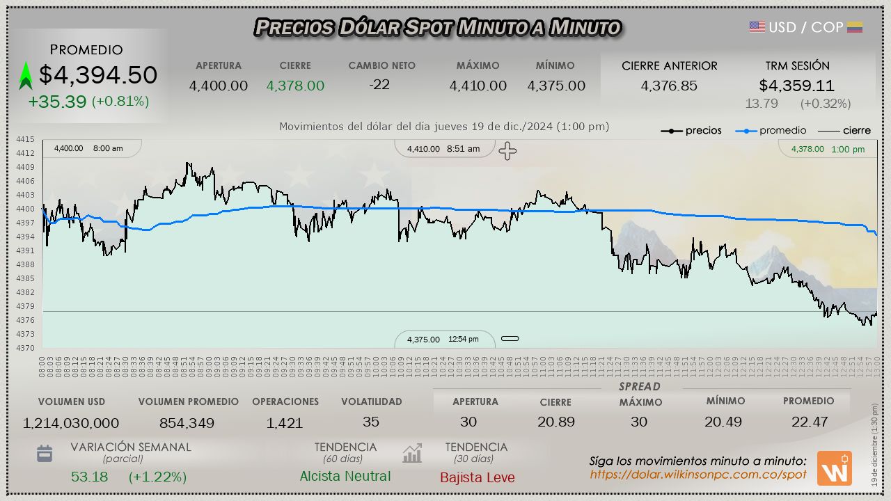 Resumen de las operaciones del mercado del dólar SPOT en Colombia correspondiente al jueves 19 de diciembre de 2024.